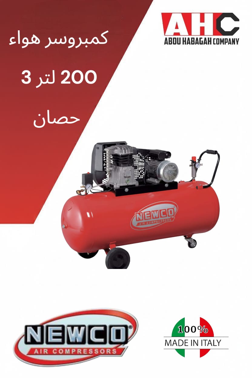 كمبروسر هواء بالسير ايطالي المقاس باللتر: 200 – شميز الرأس: زهر – القدرة بالحصان: 3ح – التصريف لتر/دقيقة: 315 – الضغط بار: 10- المصدر الكهربائي بالفولت: 220 – عدد البساتم: 2